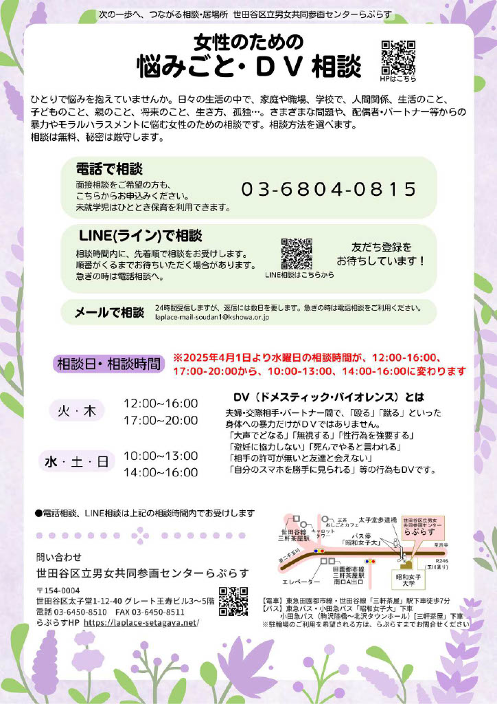 家庭、人間関係、生き方などのさまざまな問題や、配偶者やパートナー恋人などからの暴力やモラルハラスメン卜について悩む女性のための相談です。ひとりで悩まず、ご相談ください。相談は無料、秘密は厳守します。