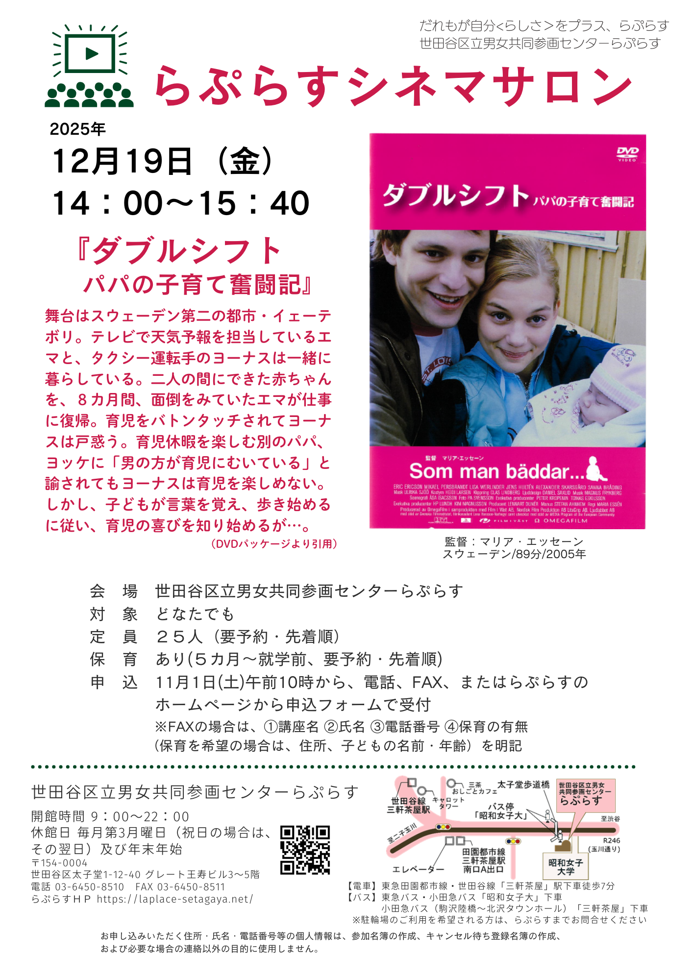 【11/1受付開始】12/19(金) らぷらすシネマサロン『ダブルシフト~パパの子育て奮闘記~』
