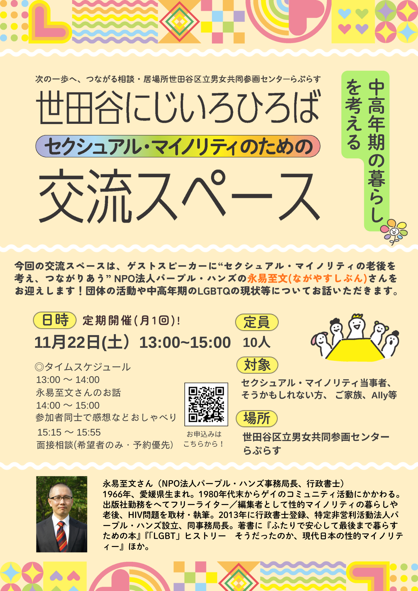 今回の交流スペースは、ゲストスピーカーに“セクシュアル・マイノリティの老後を考え、つながりあう” NPO法人パープル・ハンズの永易至文(ながやすしぶん)さんをお迎えします!団体の活動や中高年期のLGBTQの現状等についてお話いただきます!