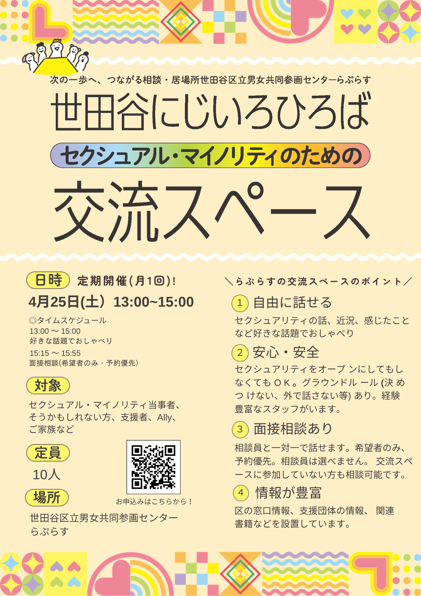【4/1受付開始】4/25(土)セクシュアル・マイノリティのための世田谷にじいろひろば交流スペース<定期開催>